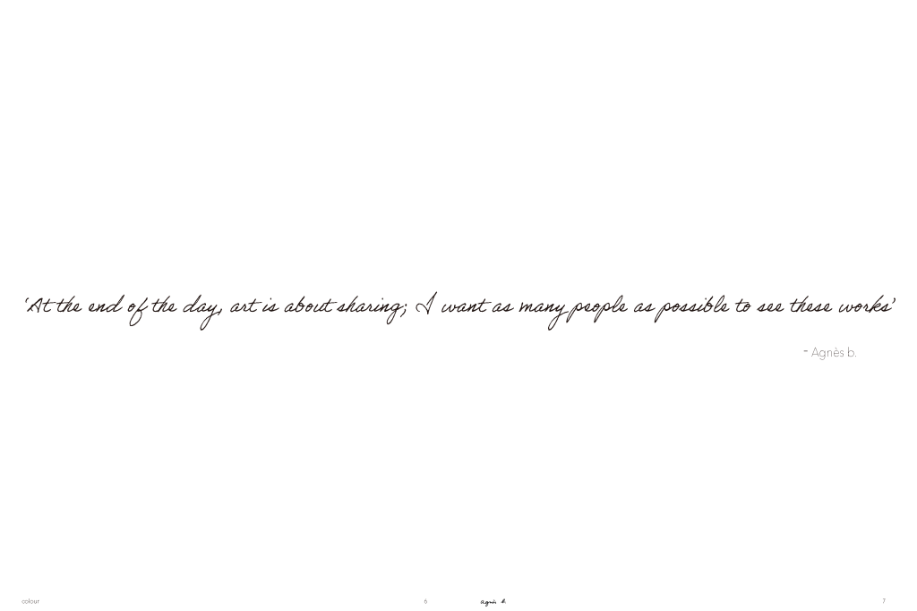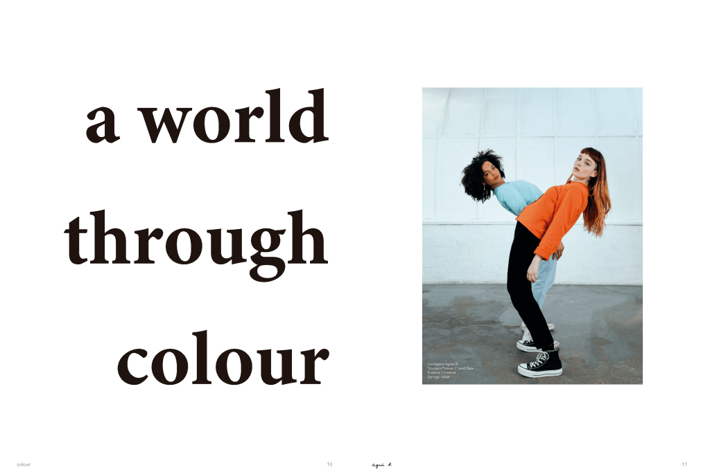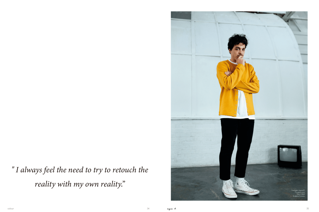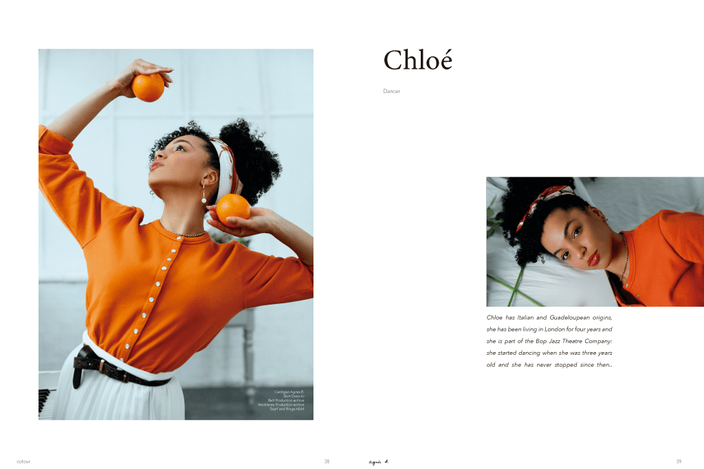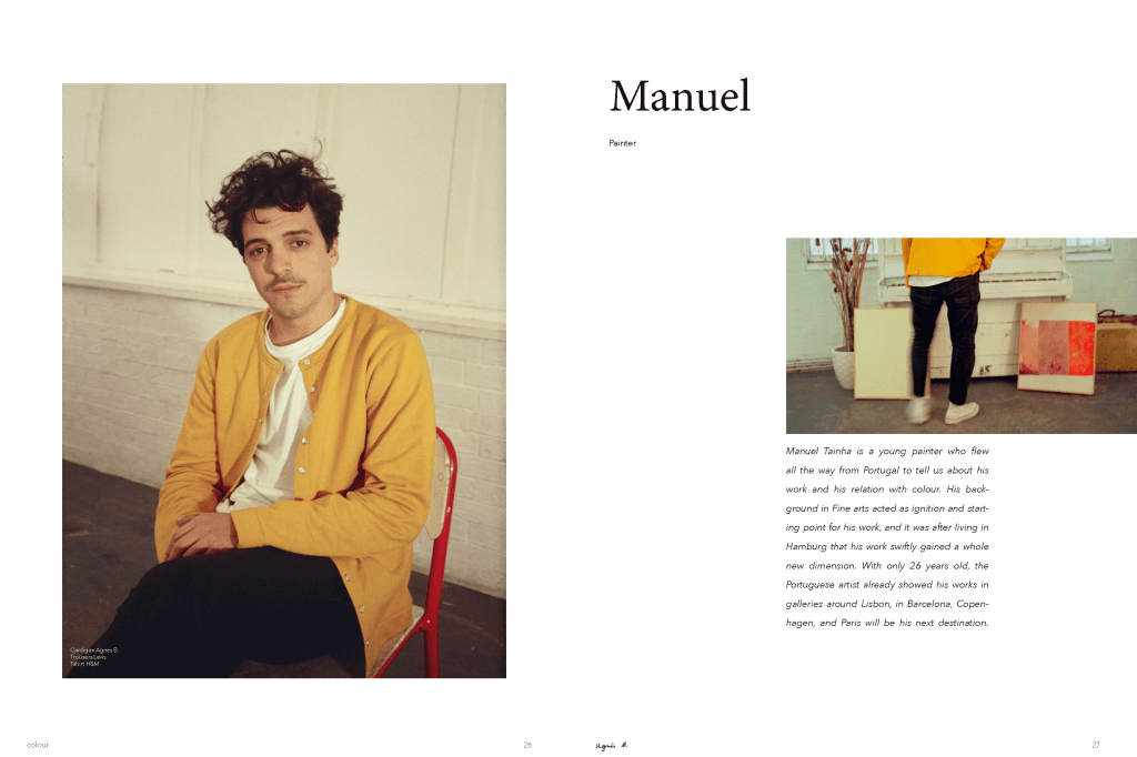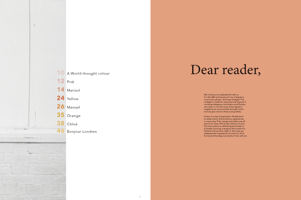 We invite you to celebrate Art with us. It is the 40th anniversary of one of Agnès b. most iconic pieces: the Snap cardigan! The cardigan is made for everyone and anyone; it combines elegance, minimalism and Parisian chic style. In our first issue of the Agnès b. magazine we communicate through colour and we give voice to three young artists. Colour is a way of expression. People tend to relate colour with emotions, experiences or memories. Pink, orange and yellow are all part of our lives. Pink as the memory of your first love; yellow as refreshing lemonade on a Sunday morning; orange as the sunset of a Parisian mid-summer night. In this issue we celebrate the importance of colour (in all its forms) and the deep connection it has with art.