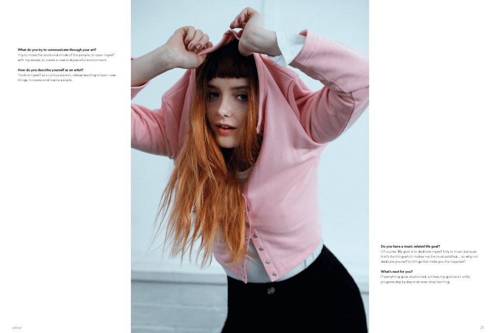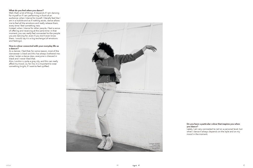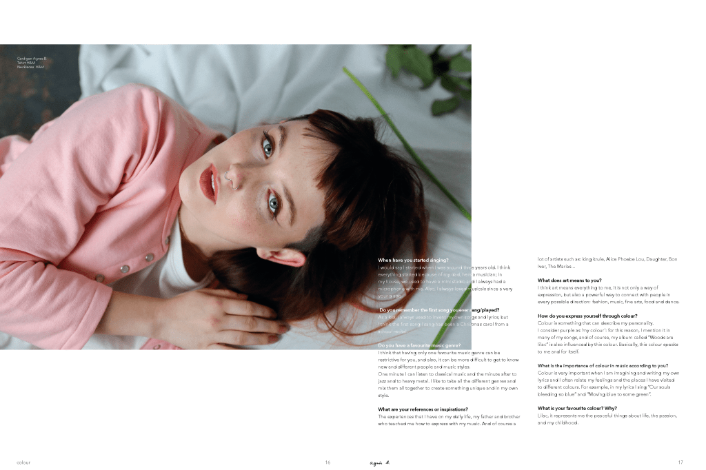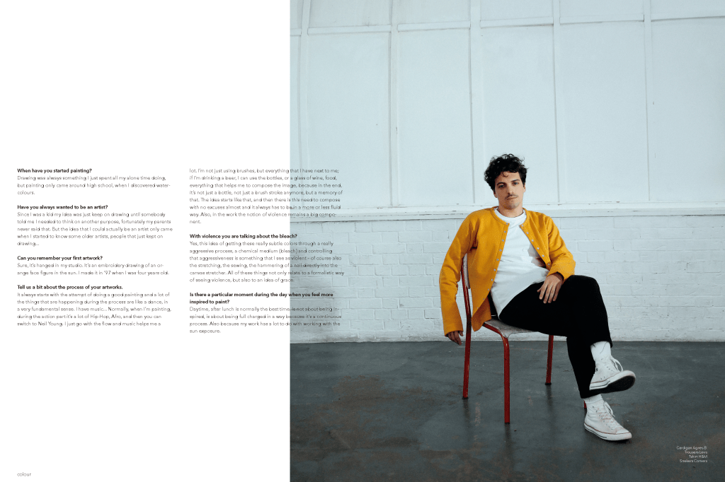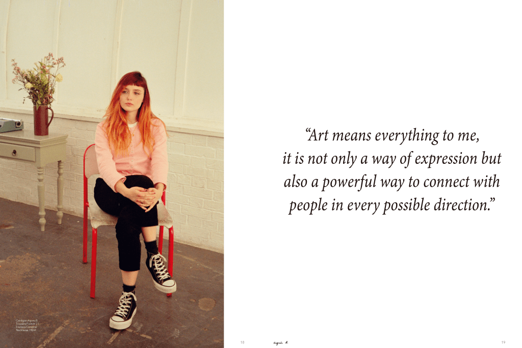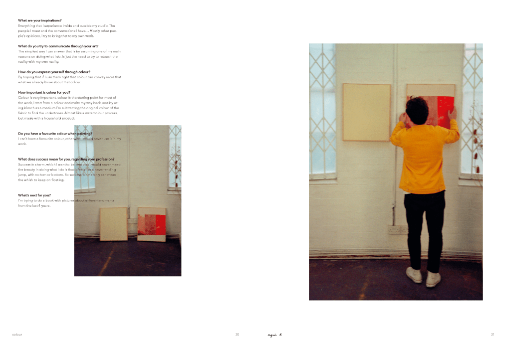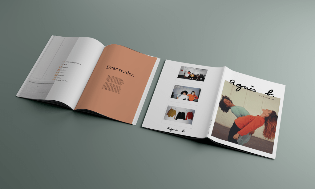 We invite you to celebrate Art with us. It is the 40th anniversary of one of Agnès b. most iconic pieces: the Snap cardigan! The cardigan is made for everyone and anyone; it combines elegance, minimalism and Parisian chic style. In our first issue of the Agnès b. magazine we communicate through colour and we give voice to three young artists. Colour is a way of expression. People tend to relate colour with emotions, experiences or memories. Pink, orange and yellow are all part of our lives. Pink as the memory of your first love; yellow as refreshing lemonade on a Sunday morning; orange as the sunset of a Parisian mid-summer night. In this issue we celebrate the importance of colour (in all its forms) and the deep connection it has with art.